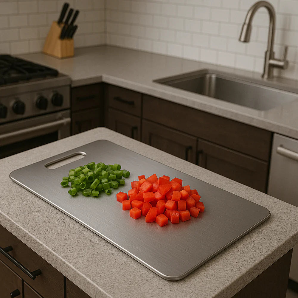 Svar 1: Skurðbrettið er úr sterku ryðfríu stáli og títanblöndu, sem tryggir einstaka endingu og slitþol, sem gerir það tilvalið til daglegrar notkunar án þess að það komi niður á afköstum eða stíl.